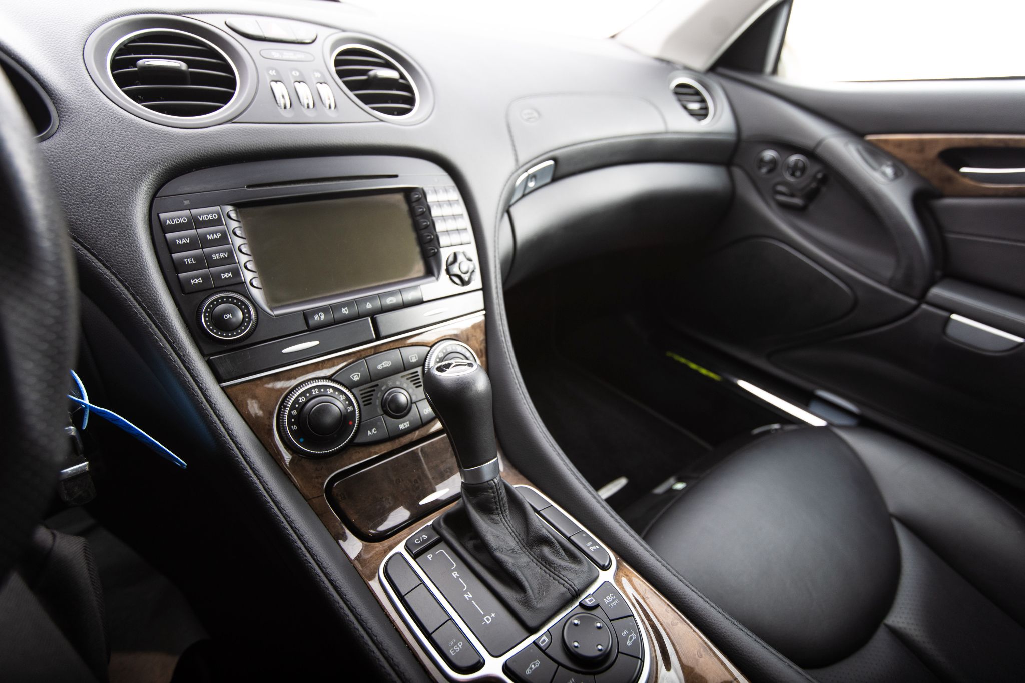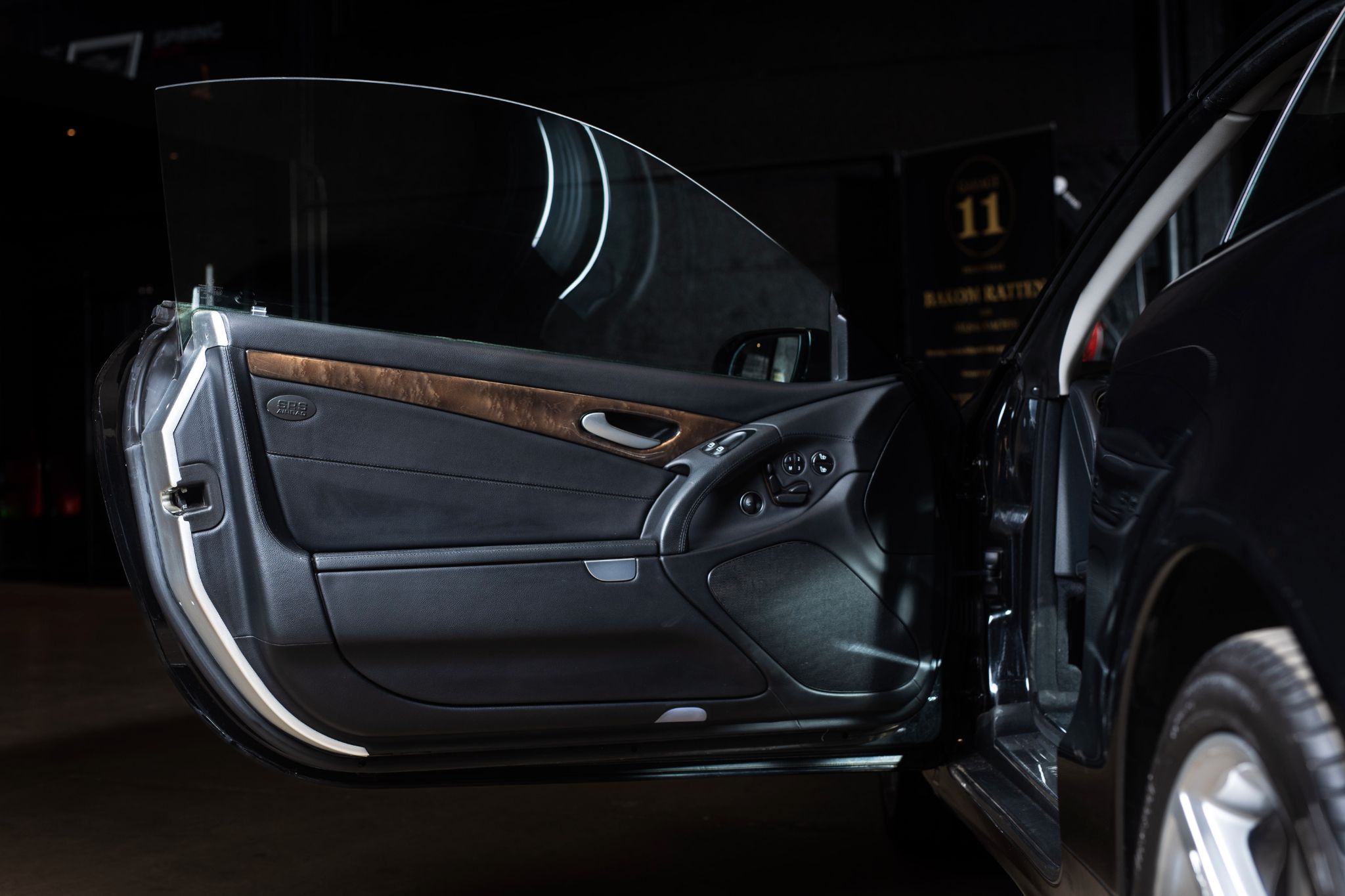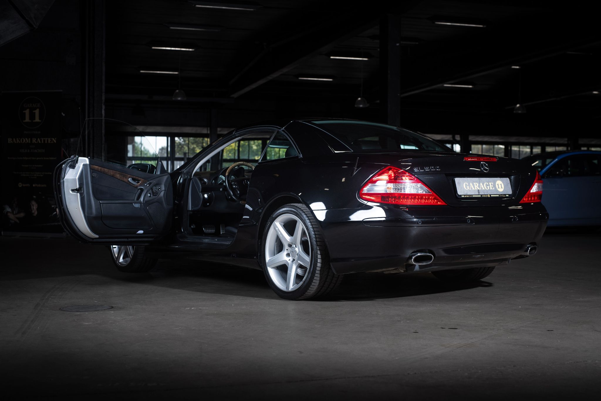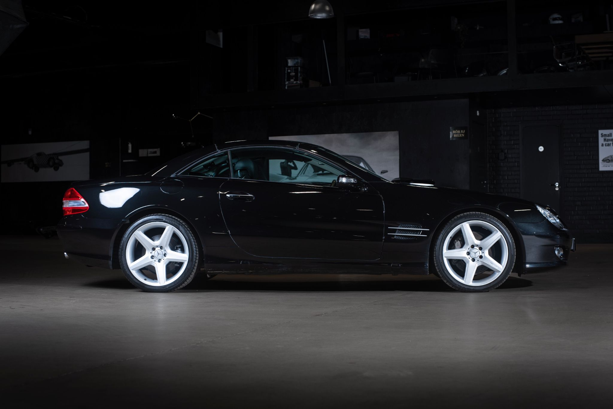 Exteriören är klassiskt svart metallic och vilar på original 18” fälgar i fem-ekrad design, en kombination som ger bilen en tidlös men självklar pondus. Fronten med sina dubbla strålkastare och kromade grill är ikonisk för tiden och gör att bilen känns lika självklar på strandpromenaden i Nice som på E4:an en sommardag.
