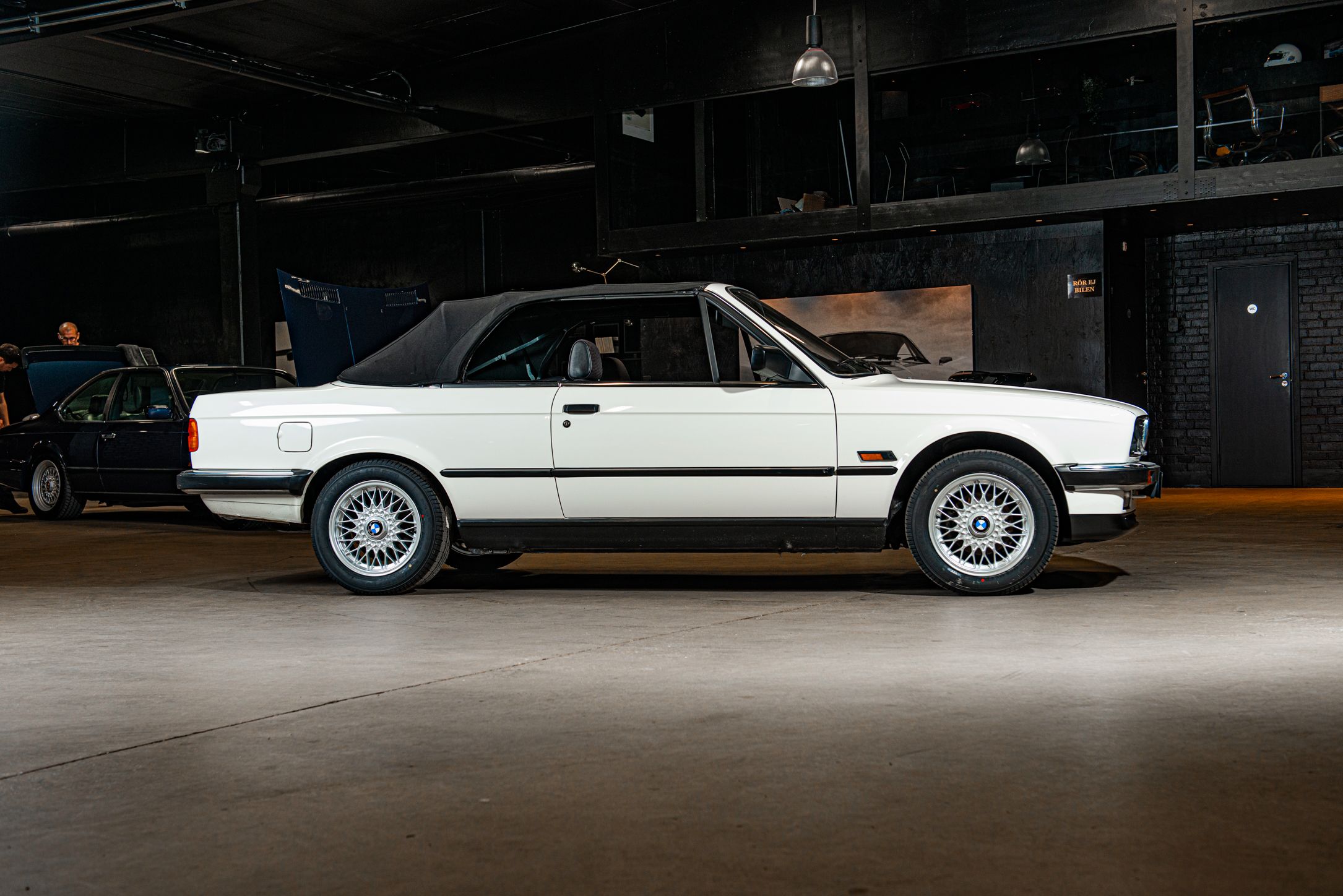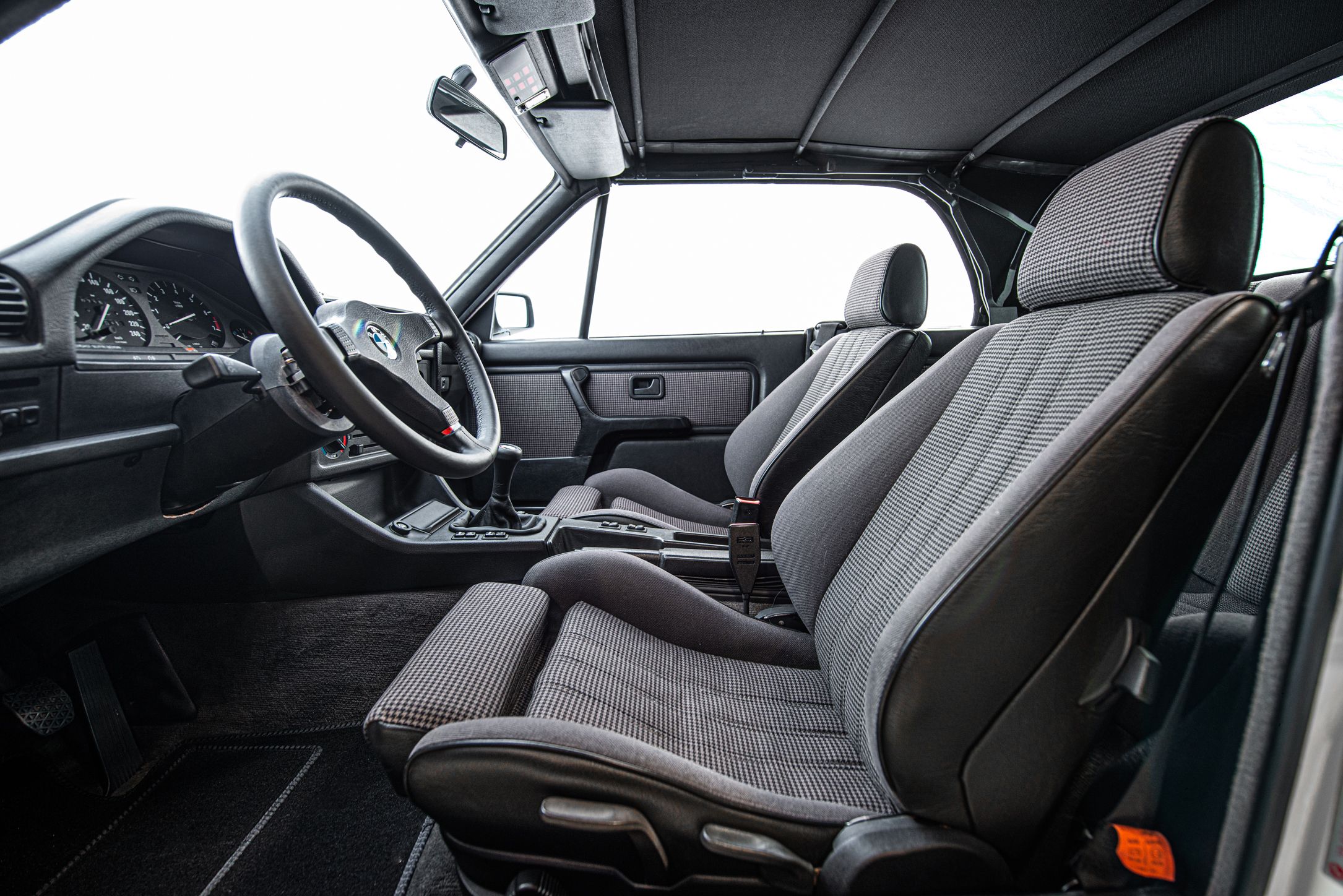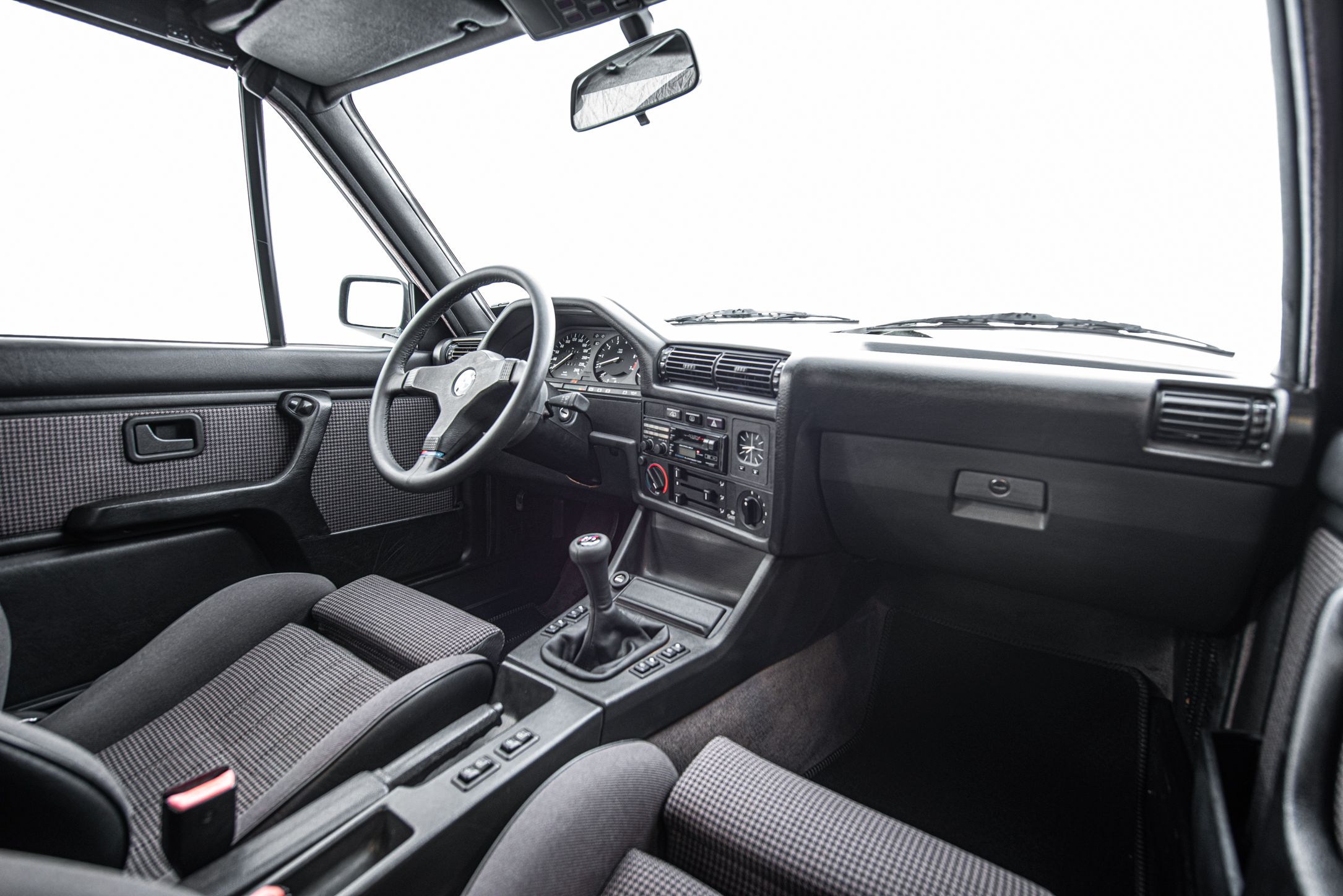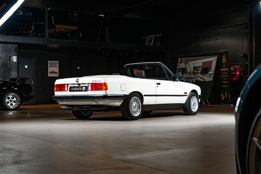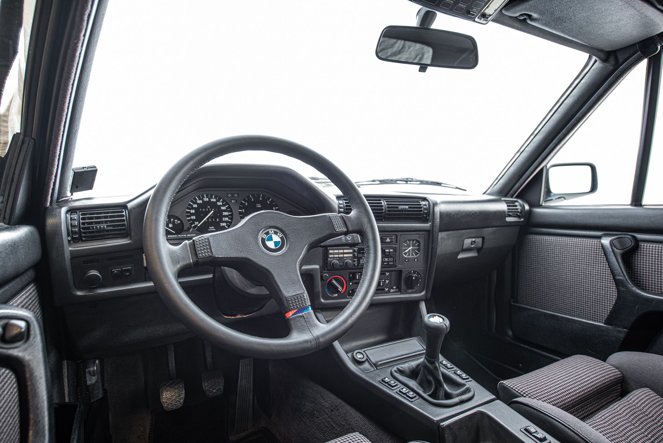 Exteriören är i klassiska och tidsenliga Alpinvit. En färg som framhäver E30's enkla formspråk och när det som här paras med klassiska 'kapsyl-fälgar' så blir det inte mycket bättre. Suffletten går i svart och är ny. Fortsätt bakåt och man möts av en klassiskt kantig 80-tals form med ett enkelt '325i' emblem över bakluckan. Det svarta taket fälls manuellt öppnar upp den eleganta tyg interiören till omvärlden. Insidan av en E30 var när det begav sig i framkant på modernt tänkande och funktionsmässigt svårslagen. Det vi idag associerar med en 3-serie återfinns inte här. Ingen CarPlay. Ingen adaptiv farthållare. Men däremot en körupplevelse som är svår att mäta sig med. Framför föraren en enkle tre ekrad ratt med M färgerna i botten och strax bakom ett enkelt mätarhus.