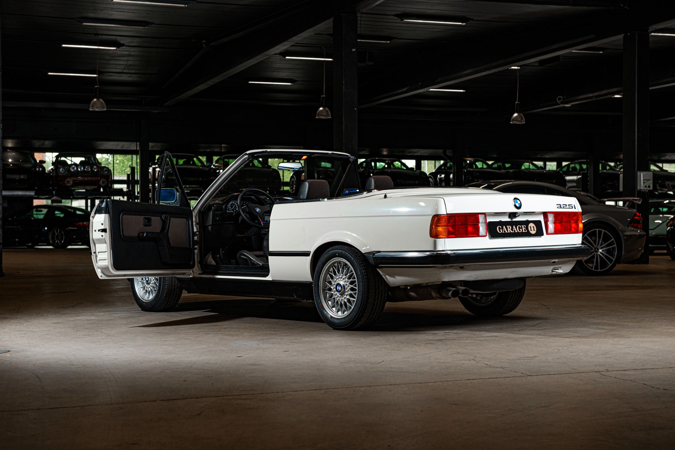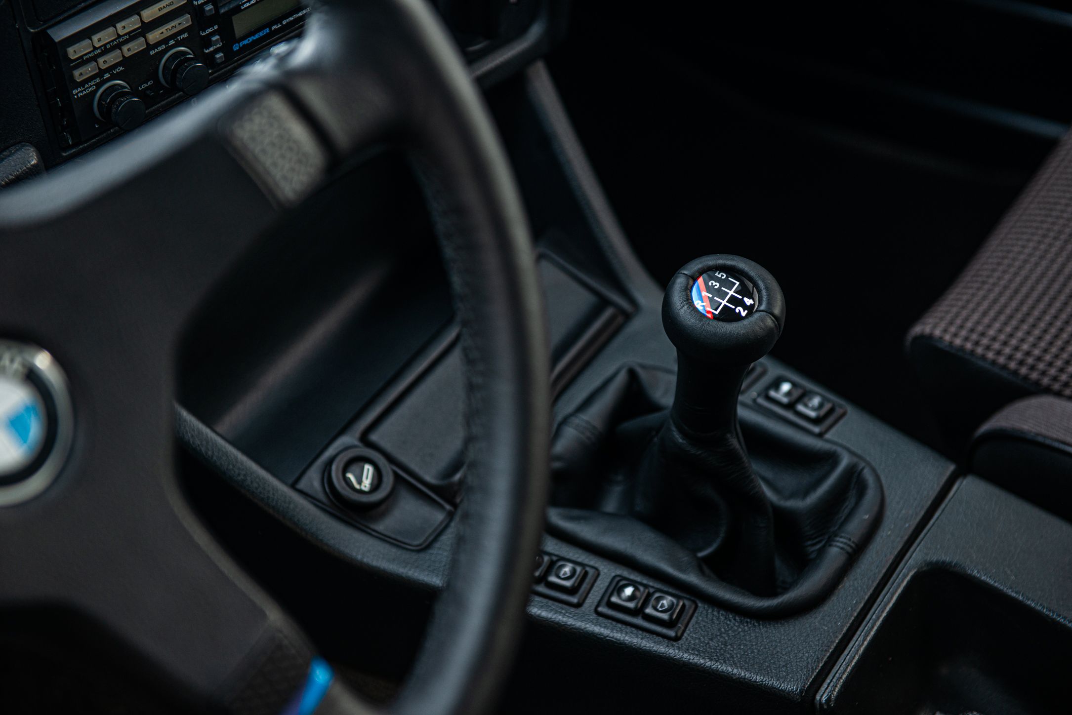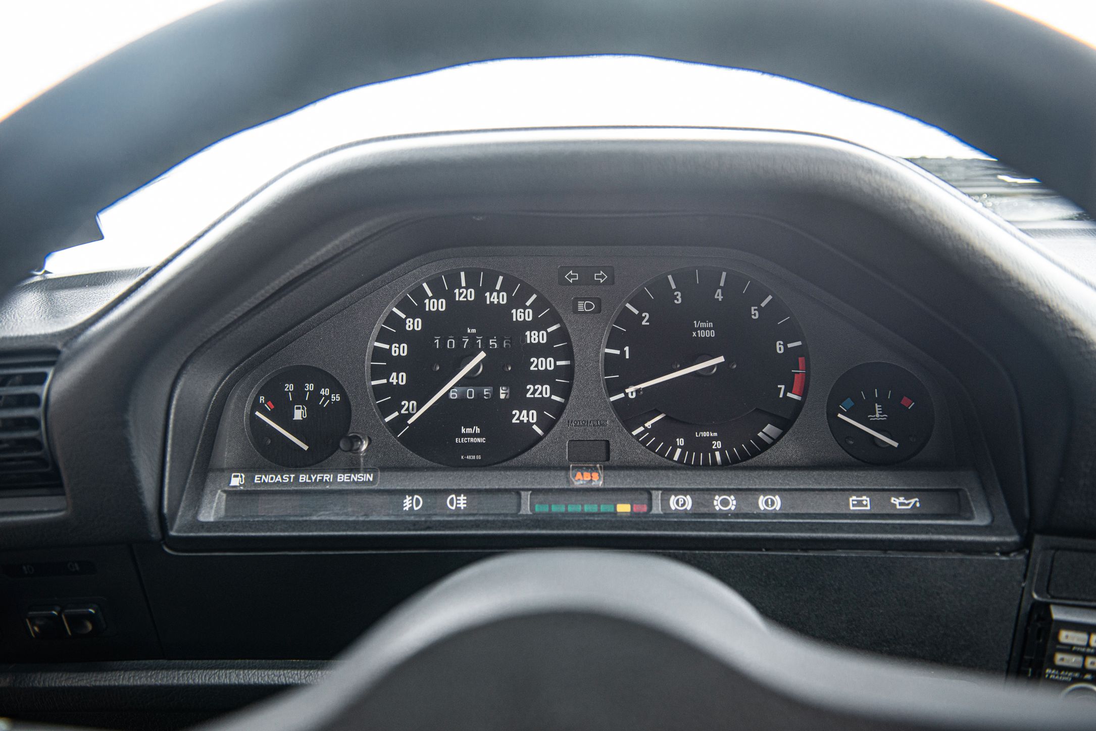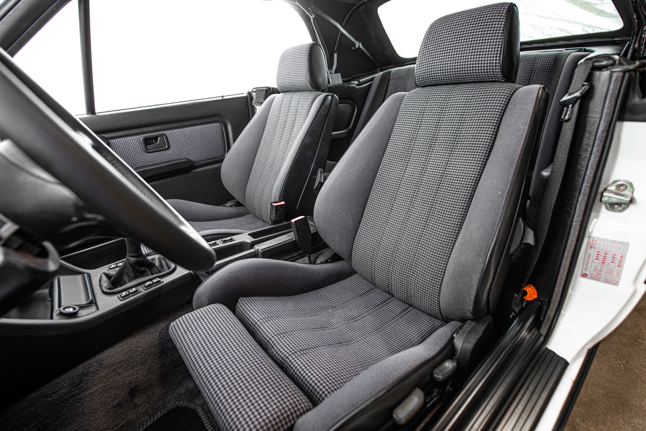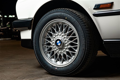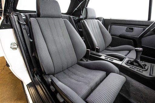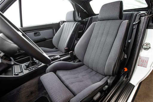 Exteriören är i klassiska och tidsenliga Alpinvit. En färg som framhäver E30's enkla formspråk och när det som här paras med klassiska 'kapsyl-fälgar' så blir det inte mycket bättre. Suffletten går i svart och är ny. Fortsätt bakåt och man möts av en klassiskt kantig 80-tals form med ett enkelt '325i' emblem över bakluckan. Det svarta taket fälls manuellt öppnar upp den eleganta tyg interiören till omvärlden. Insidan av en E30 var när det begav sig i framkant på modernt tänkande och funktionsmässigt svårslagen. Det vi idag associerar med en 3-serie återfinns inte här. Ingen CarPlay. Ingen adaptiv farthållare. Men däremot en körupplevelse som är svår att mäta sig med. Framför föraren en enkle tre ekrad ratt med M färgerna i botten och strax bakom ett enkelt mätarhus.
